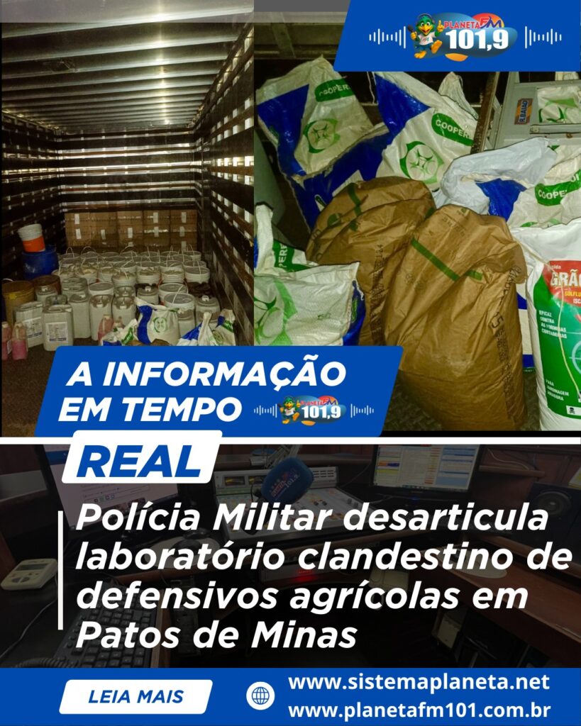 Ação ocorreu no bairro Cristo Redentor após denúncias anônimas; grande quantidade de produtos falsificados foi apreendida A Polícia Militar desarticulou, na tarde de quinta-feira (15), um laboratório clandestino de manipulação e fracionamento de defensivos agrícolas no bairro Cristo Redentor, em Patos de Minas. A ação foi desencadeada após denúncias anônimas de moradores, que relataram movimentação atípica em um imóvel, com intenso fluxo de pessoas — inclusive no período noturno — além de forte odor característico de produtos químicos. De posse das informações, equipes policiais se deslocaram até o endereço indicado e constataram que o portão de uma residência ainda em construção encontrava-se aberto. No interior do imóvel, os militares flagraram dois indivíduos, de 16 e 43 anos, utilizando equipamentos de proteção individual enquanto manipulavam, pesavam e selavam produtos agropecuários em uma estrutura improvisada semelhante a um laboratório. No local, havia diversas embalagens espalhadas e maquinário utilizado para o fracionamento e acondicionamento do material. Durante a abordagem, os envolvidos informaram que os produtos seriam destinados à comercialização e que pertenceriam a um terceiro indivíduo, de 41 anos, que teria deixado o local momentos antes da chegada da polícia. Diante da situação, foi realizada busca no imóvel, onde os militares encontraram grande quantidade de defensivos agrícolas, parte ainda lacrada e outra já fracionada, além de balança de precisão, máquina seladora e outros equipamentos, caracterizando atividade irregular e potencialmente perigosa. Em continuidade às diligências, os militares receberam informações de que parte do material estaria armazenada em outro endereço. No local indicado, também em Patos de Minas, foi localizada uma mulher de 67 anos que, após os esclarecimentos, franqueou a entrada da equipe. No interior da residência, foram apreendidas 25 caixas de cigarros, além de defensivos agrícolas e inseticidas armazenados de forma irregular, alguns fracionados em pequenas porções. Segundo verificação preliminar por meio de etiquetas, há indícios de que parte dos produtos seja de origem estrangeira, possivelmente do Paraguai. Em razão do elevado risco à saúde humana e ao meio ambiente, foi acionado apoio do Corpo de Bombeiros Militar e de profissionais do Instituto Mineiro de Agropecuária (IMA), que acompanharam toda a ocorrência. Técnicos informaram que grande parte do material apresentava sinais de falsificação, sendo manipulada com adição de outras substâncias antes da comercialização. Durante a ação policial, diversas pessoas chegaram ao local em veículos, possivelmente para adquirir os produtos, mas deixaram a área ao perceberem a presença policial. Devido ao grande volume apreendido, foi necessário o apoio de um caminhão da Polícia Militar para o transporte e acondicionamento seguro dos materiais. Os envolvidos, com idades de 16, 43 e 67 anos, foram conduzidos à delegacia para as providências cabíveis, sendo o menor acompanhado por sua responsável legal, de 45 anos. As equipes seguem em rastreamento de um suspeito de 41 anos, que não foi localizado até o encerramento do registro. A ocorrência foi registrada e encaminhada para as demais providências legais.