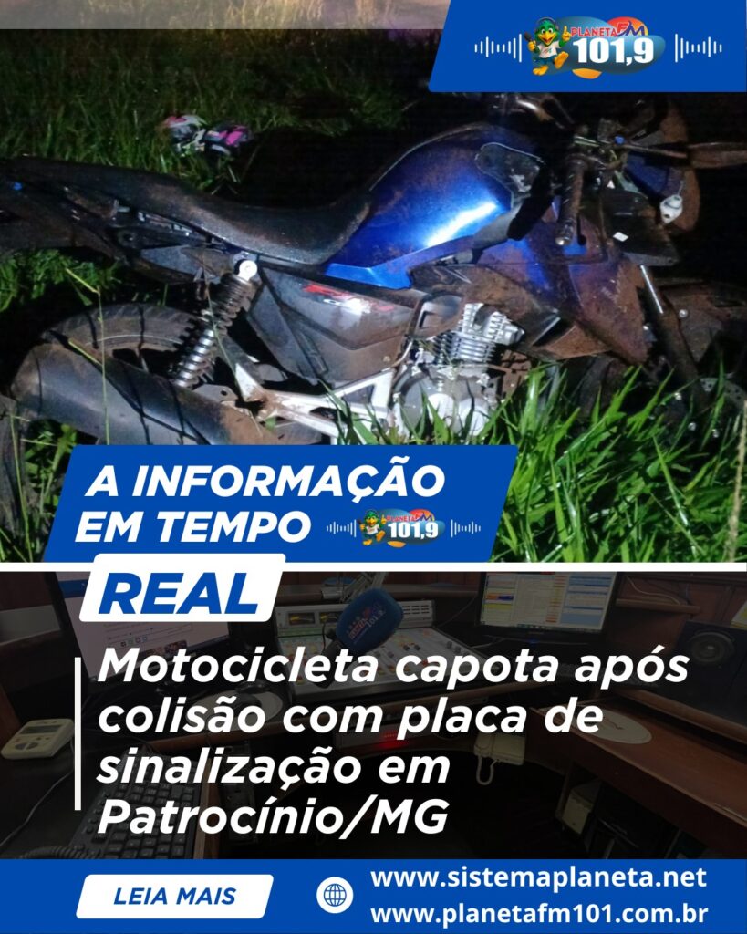 Motocicleta capota após colisão com placa de sinalização em Patrocínio/MG