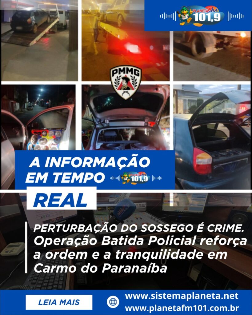 Operação Batida Policial reforça a ordem e a tranquilidade em Carmo do Paranaíba Na data de 25 de janeiro, durante o cumprimento da Operação Batida Policial, a Polícia Militar realizou diversas abordagens e ações preventivas com o objetivo de garantir a ordem pública em Carmo do Paranaíba. Durante a operação, 03 autores foram conduzidos por utilizarem som veicular em volume excessivo, caracterizando o delito de Perturbação do Sossego. 📊 Resultados da operação: 🚙 03 veículos apreendidos🦸 03 autores conduzidos🪪 02 condutores inabilitados autuados📋 05 Autos de Infração de Trânsito (AITs) confeccionados 🔔 A Polícia Militar reforça: respeitar as leis é fundamental para a convivência harmoniosa e o bem-estar de todos. 🔺 Polícia Militar de Minas Gerais – 250 anosA força do povo mineiro. Presença que protege.