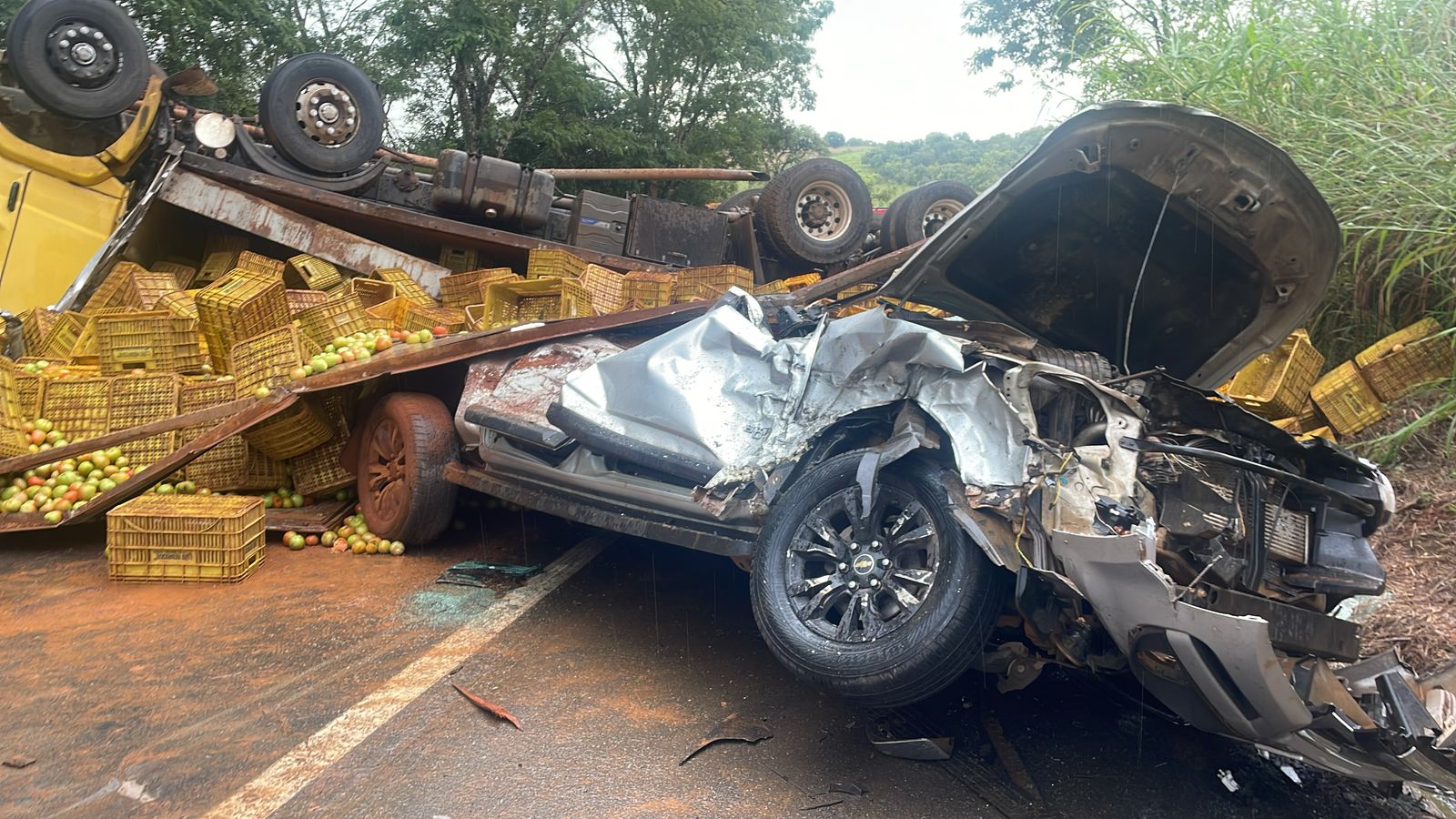 O caminhão transportava uma carga de tomates, o que exigiu a interdição parcial da via para a remoção da carga. Após a retirada dos veículos pelo serviço de guincho acionado pela seguradora, foi realizada a lavagem da pista e a via foi liberada para o tráfego normal.