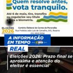 Cartório Eleitoral de Carmo do Paranaíba intensifica atendimentos e reforça importância da regularização até 6 de maio Com a aproximação das eleições de 2026, o movimento no Cartório Eleitoral de Carmo do Paranaíba já está mais intenso. O prazo final para regularização do título de eleitor, emissão da primeira via, transferência e cadastro biométrico vai até o dia 6 de maio, e a recomendação é não deixar para a última hora. A chefe do cartório eleitoral, Priscila Baggi, destacou a importância de o eleitor verificar sua situação com antecedência para garantir o direito ao voto e evitar