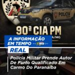 Ação rápida das guarnições resulta na prisão em flagrante após rastreamento ininterrupto Em Carmo do Paranaíba, na data de 05/04/2026, a Polícia Militar realizou a prisão de autor de furto qualificado. A Polícia Militar foi acionada em razão do furto de 01 aparelho de telefone celular e da quantia de R$ 5.000,00, ocorrido em um bar. Para concretizar o crime, o autor rompeu um obstáculo (porta), mediante o emprego de força física. De posse das informações, as guarnições iniciaram rastreamentos ininterruptos e obtiveram êxito na prisão do autor. O indivíduo relatou que cometeu o crime para sustentar