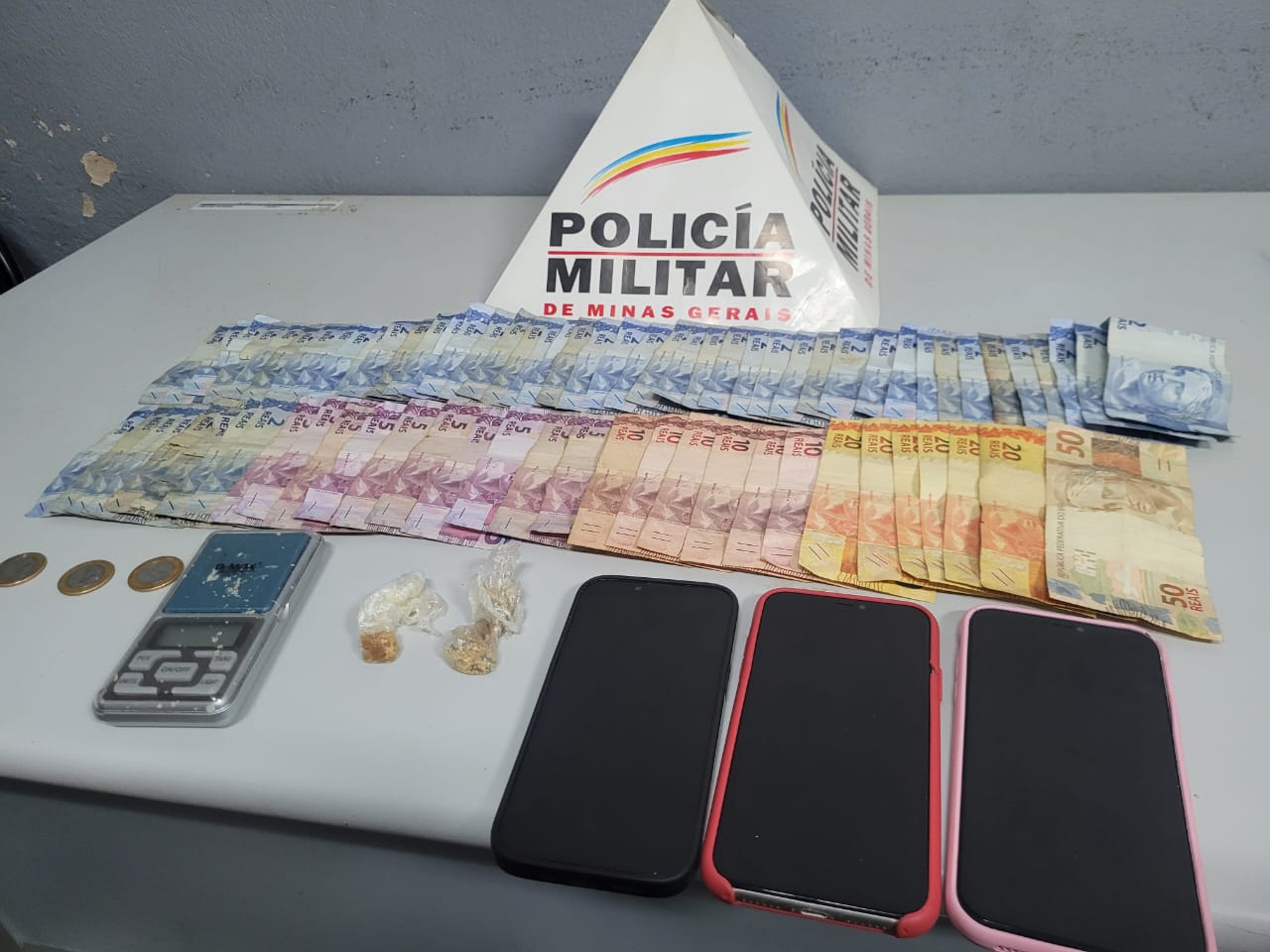 Na sequência, os militares iniciaram buscas na residência. Logo na entrada, sobre uma mesa na varanda, foi encontrada uma porção de substância semelhante ao crack. Também havia farelos da droga na janela, uma lâmina utilizada para fracionamento, uma balança de micro pesagem com vestígios de entorpecente no armário da cozinha e R$ 397,00 em cédulas, distribuídos por diferentes cômodos da casa. O imóvel encontrava-se visivelmente desorganizado.