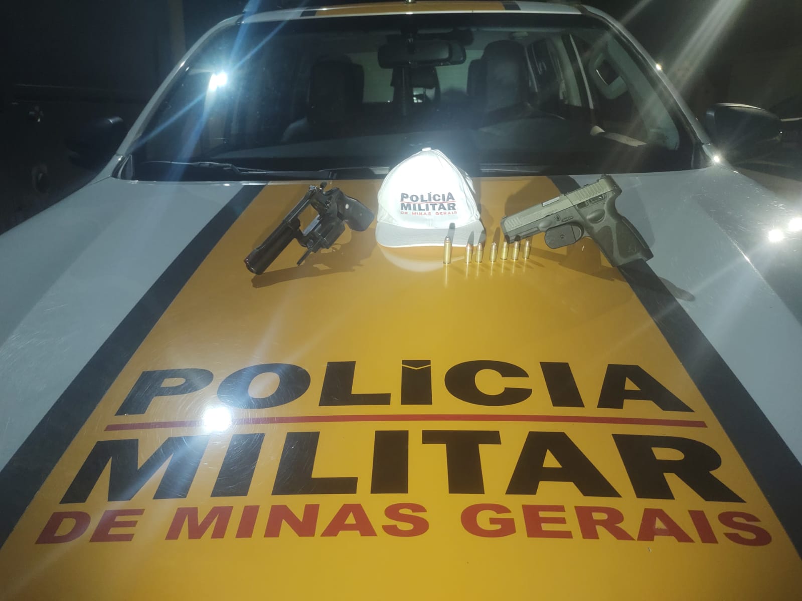 Ao realizar a busca na mochila que estava no assoalho do veículo, de propriedade do referido passageiro, os militares localizaram uma pistola calibre 9 mm, com carregador contendo seis munições intactas, e um revólver calibre .357 com uma munição no tambor.